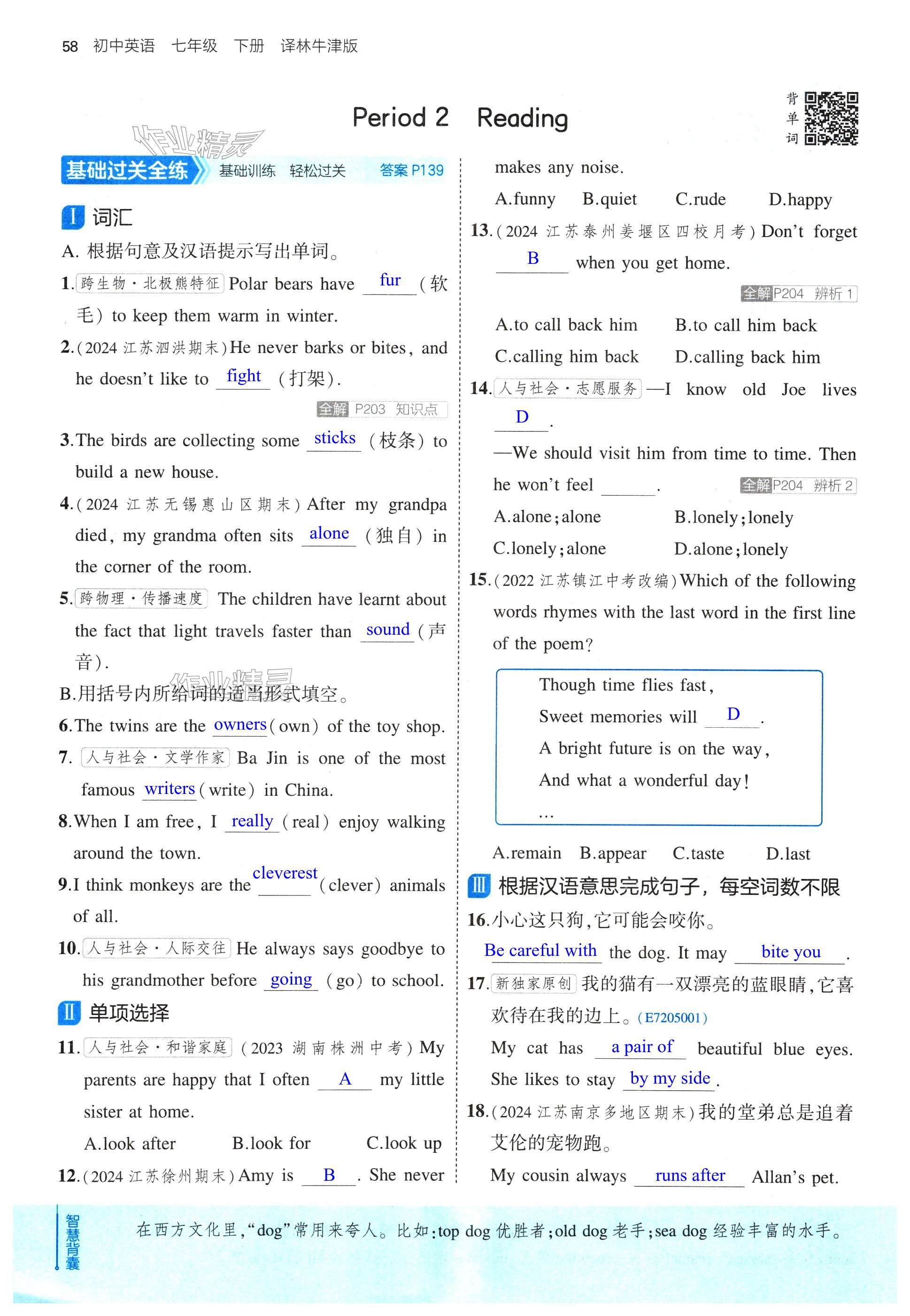 注:目前有些书本章节名称可能整理的还不是很完善,但都是按照顺序排列的,请同学们按照顺序仔细查找。练习册 2025年5年中考3年模拟七年级英语下册译林版 答案主要是用来给同学们做完题方便对答案用的,请勿直接抄袭。