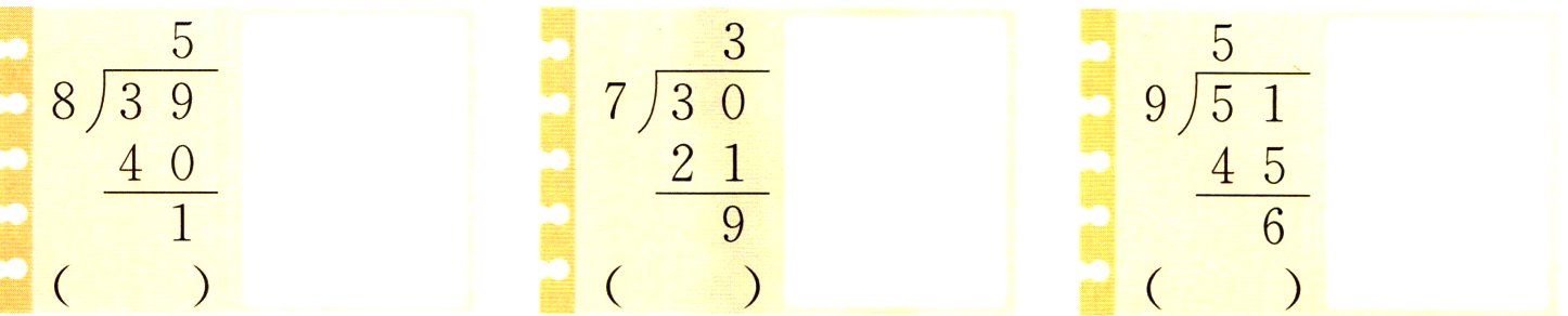 ②$\begin{array}{r}4\\8\enclose{longdiv}{39}\\32\\\hline7\end{array}$ ③$\begin{array}{r}4\\7\enclose{longdiv}{30}\\28\\\hline2\end{array}$ ①$\begin{array}{r}5\\9\enclose{longdiv}{51}\\45\\\hline6\end{array}$