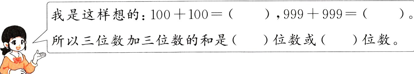2. 三位数加三位数的和是几位数呢?想一想,填一填。