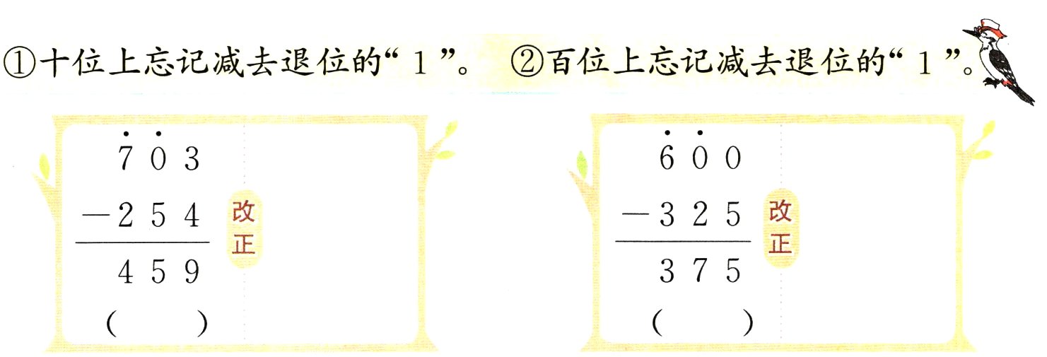①十位上忘记减去退位的“1”。 ②百位上忘记减去退位的“1”。