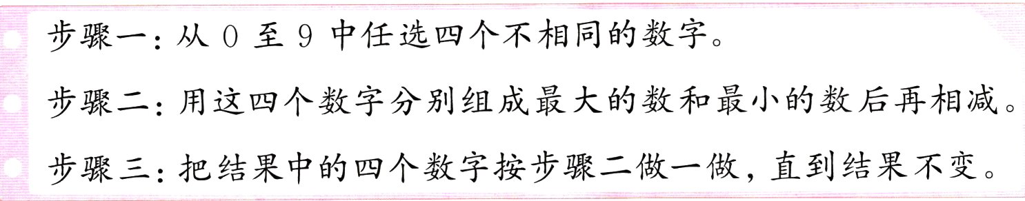 我们已经发现了三位数的“数字黑洞”,那么大家可以对应地思考一下:四位数有“数字黑洞”吗?按下面的步骤做一做。