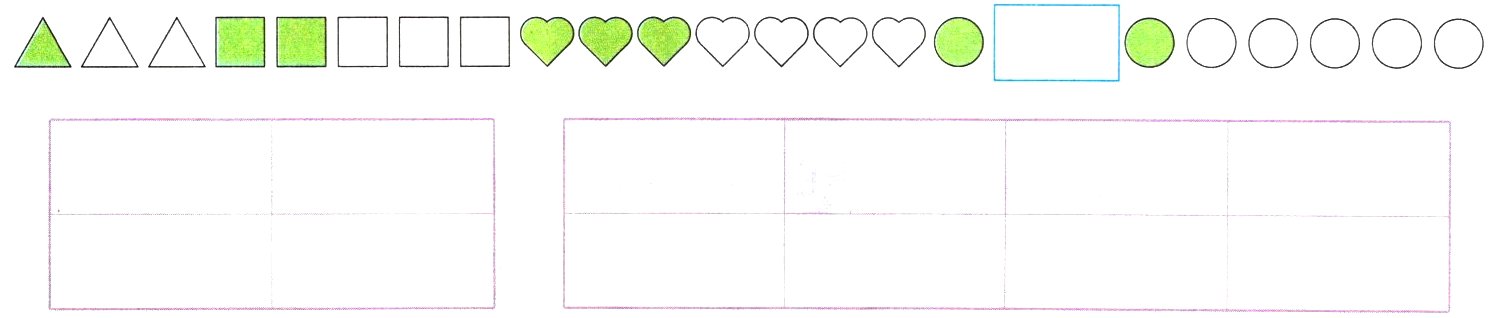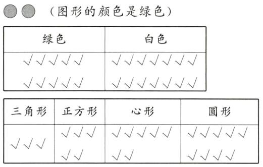 按不同的标准分类整理,题目已经给出了分成两类和分成四类的表格,观察发现按颜色分可分成两类,绿色图形有10个,白色图形有14个;按形状分可分成四类,三角形有3个,正方形有5个,心形有7个,圆形有9个。用自己喜欢的方法表示出来即可。