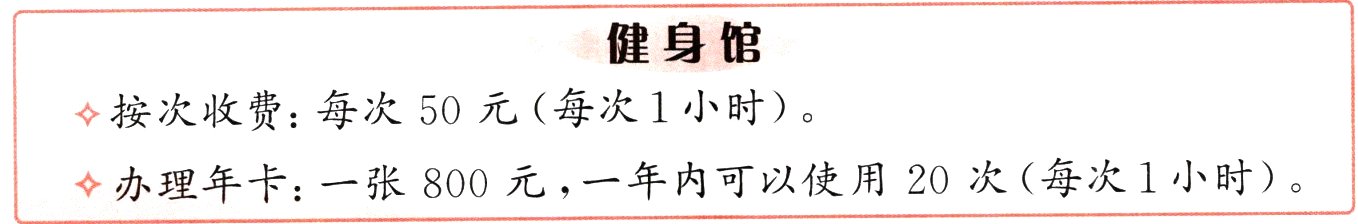 张叔叔办理了一张年卡,实际他只去了14次(每次1小时),卡就到期作废了。结合张叔叔的实际健身情况算一算,张叔叔办理的这张年卡划算吗?
