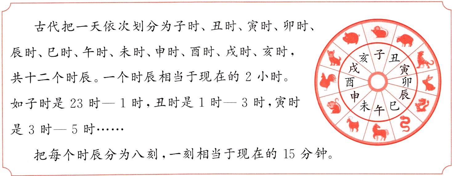 古代把一天依次划分为子时、丑时、寅时、卯时、辰时、巳时、午时、未时、申时、酉时、戌时、亥时,共十二个时辰。一个时辰相当于现在的2小时。如子时是23时—1时,丑时是1时—3时,寅时是3时—5时……