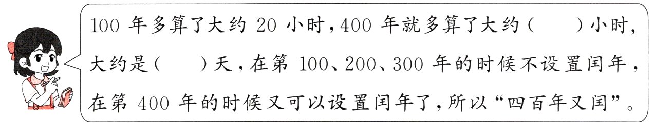 100年多算了大约20小时,400年就多算了大约( )小时,大约是( )天,在第100、200、300年的时候不设置闰年,在第400年的时候又可以设置闰年了,所以“四百年又闰”。