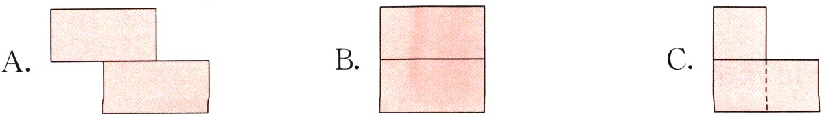 1. 分别用两个长10厘米、宽5厘米的长方形摆出下面三个图形,周长最长的是( ),面积最小的是( )。