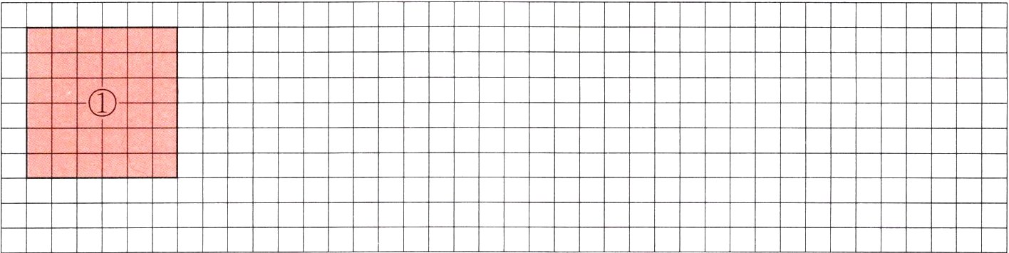 1. 正方形①的面积是( )平方厘米。画出两个与正方形①面积相等的不同的长方形,长方形的周长分别是( )厘米和( )厘米。
