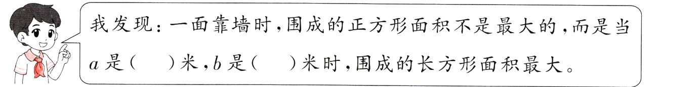 我发现:一面靠墙时,围成的正方形面积不是最大的,而是当$a$是( )米,$b$是( )米时,围成的长方形面积最大。