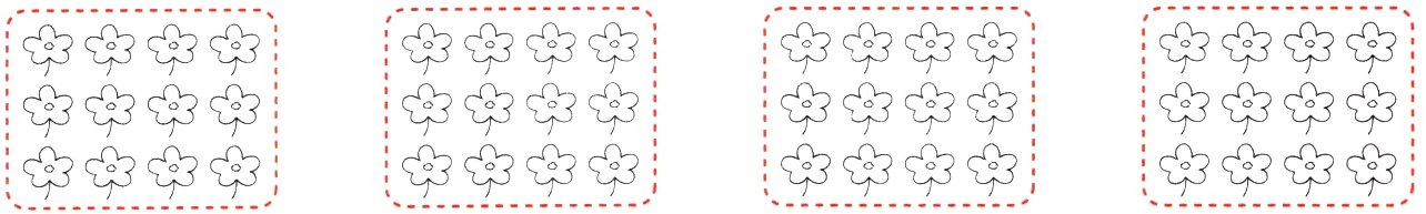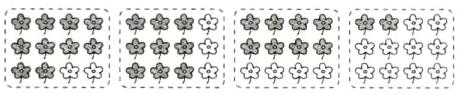 3. 每组小花有12朵,涂色表示第一组小花的$\frac{5}{6}$和第二组小花的$\frac{3}{4}$。你还能涂色表示12朵小花的几分之几?涂一涂。表示出的分别是$\frac{()}{()}$和$\frac{()}{()}$。