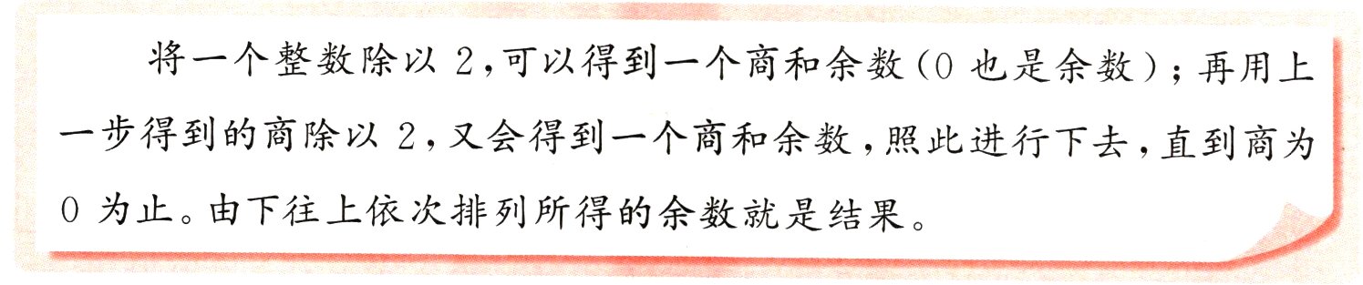 将一个整数除以2,可以得到一个商和余数(0也是余数);再用上一步得到的商除以2,又会得到一个商和余数,照此进行下去,直到商为0为止。由下往上依次排列所得的余数就是结果。