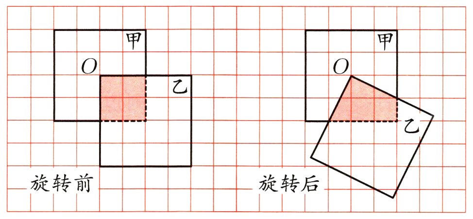 由上图可知,旋转后重叠部分可分为①②两部分,其中三角形①绕点O逆时针旋转90°后与三角形③完全重合。所以重叠部分的面积可转化为四边形②与三角形③的面积和,也是正方形甲面积的$\frac{1}{4}$。所以旋转前和旋转后重叠部分的面积大小相等。