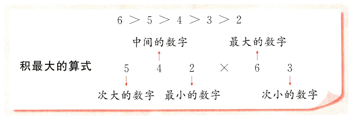 要使积最大,就要使每个乘数都尽可能大,所以把较大的2个数字分别放在三位数的百位和两位数的十位上,那么组成的算式有以下6种可能性。