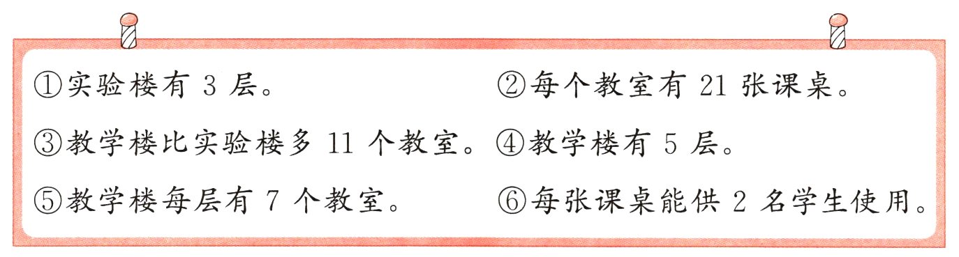 ⑤教学楼每层有7个教室。 ⑥每张课桌能供2名学生使用。