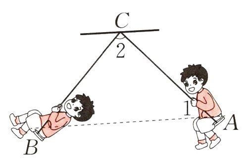 (1)如右图,一个小朋友坐在秋千上从点A荡到点B,连接A、B、C三点可以组成三角形ABC。已知∠1 = 47°,那么∠2 = ( )°;这个三角形按角分是( )三角形。