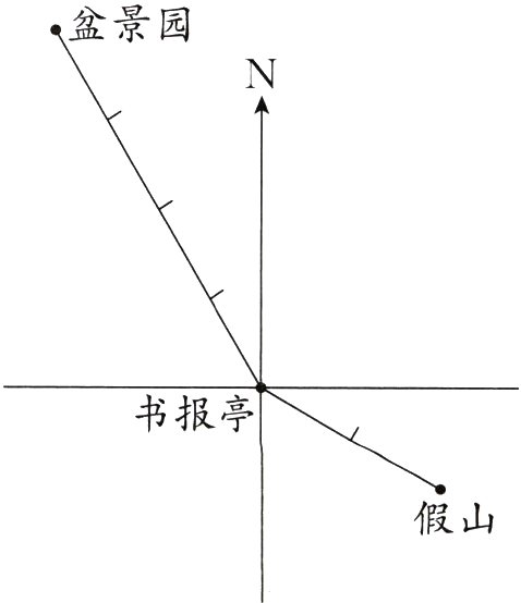 2. 假山在书报亭的( )偏( )( )°方向( )米处。
