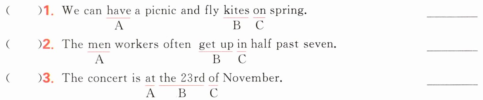 <点拨> 第1小题,spring为季节名词,季节名词前要用介词in,故选C,将on改为in。第2小题,half past seven意为“七点半”,是一个具体的时刻,前面的介词要用at,故选C,将in改为at。第3小题,the 23rd of November意为“11月23日”,在具体的日期前要用介词on,故选A,将at改为on。