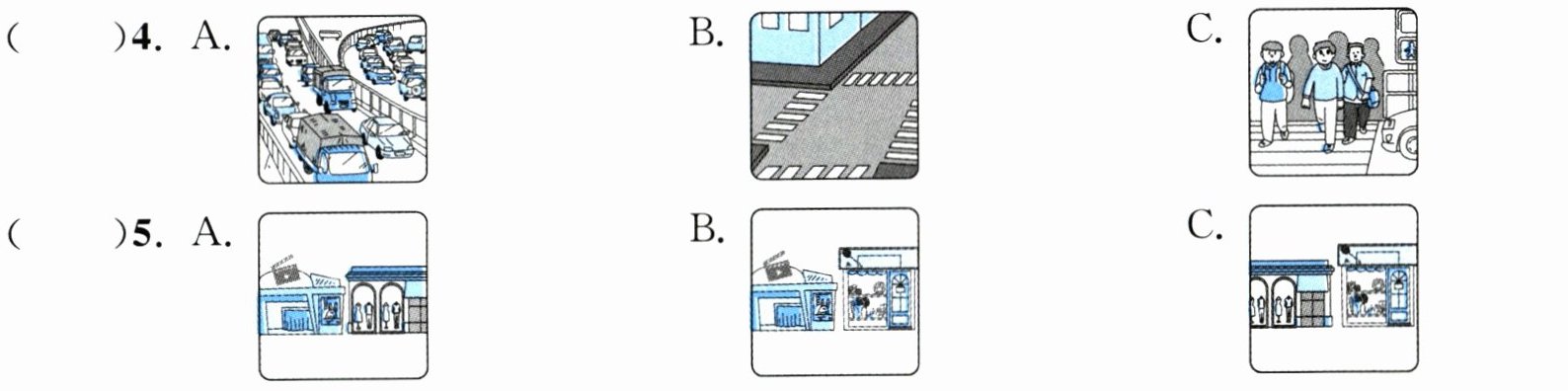 ( )4. A. In the morning. B. She sleeps at home. C. At the bus stop.