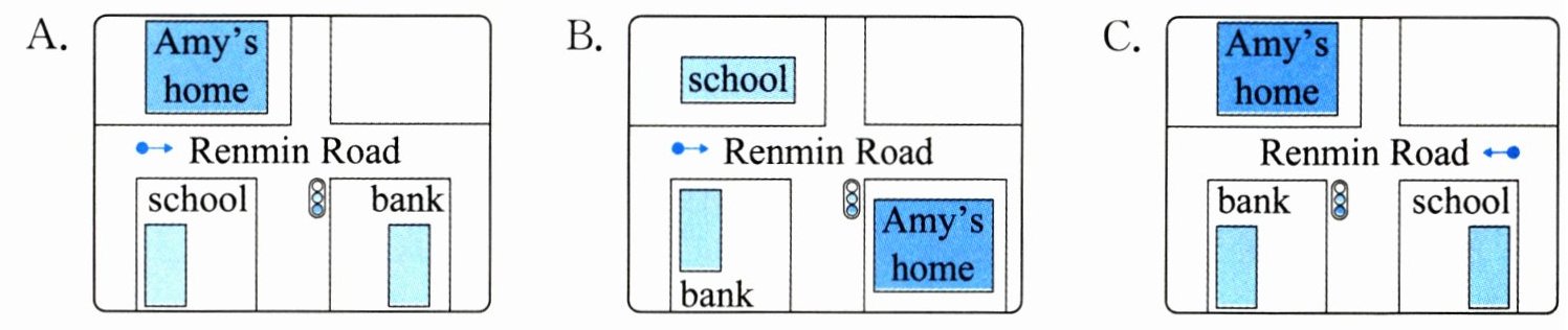 Amy:My home is near the school. Walk along Renmin Road to the traffic lights, and you will see a bank. My home is opposite it.