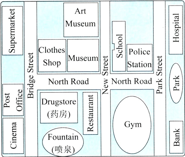 1. There are four./Four. 2. It's on Bridge Street./It's next to the cinema./It's opposite the drugstore. 3. No, it isn't. 4. Go along New Street and turn left at the first crossing. Then turn left at the police station. Next, go along Park Street for a while and he can see the hospital on his right.