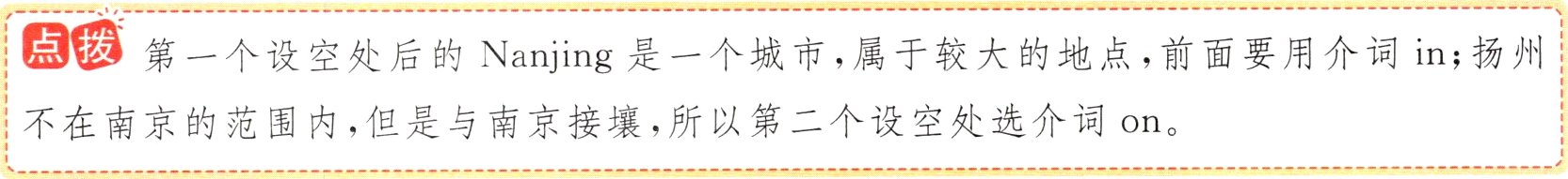 —At about 8:30.You know,Yangzhou is just______(on/to)the northeast of Nanjing.