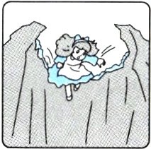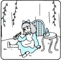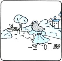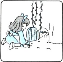 The rabbit jumps into a big hole. Alice jumps into the hole too. But she can’t see the rabbit! Alice finds a small door and a small key. She opens the small door with the key. “The rabbit runs through the door!” she thinks.