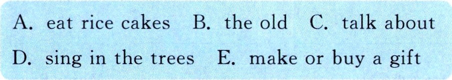 A. eat rice cakes B. the old C. talk about D. sing in the trees E. make or buy a gift