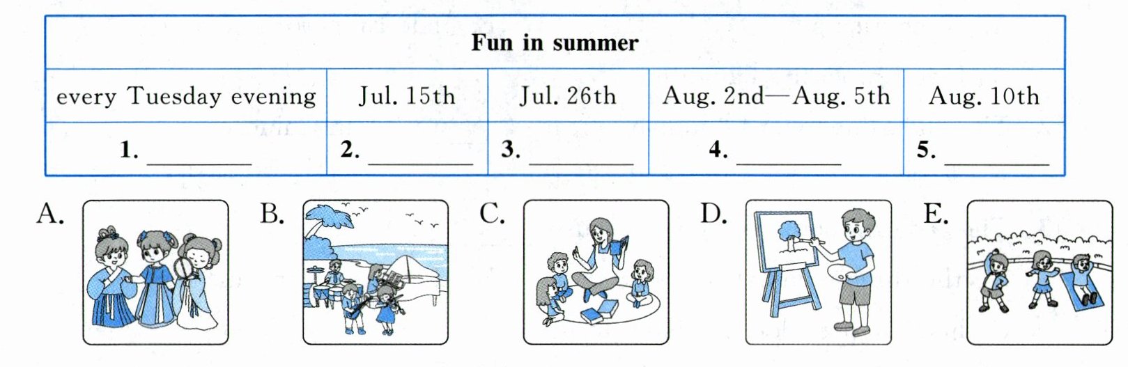 五、听录音,根据所听短文,选择与时间相对应的活动图片,完成下面的表格。(听两遍,10分)