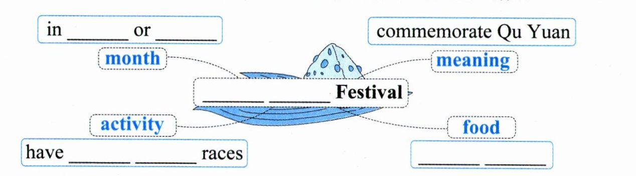 “五月五,是端阳。插艾叶,带香囊。吃粽子,撒白糖。龙船下水喜洋洋。”这首民谣是关于哪个节日的呢?请先填好下面的思维导图,并根据所填的思维导图写一篇不少于40 词的小短文介绍一下这个节日。可适当拓展,已给内容不计入总词数。