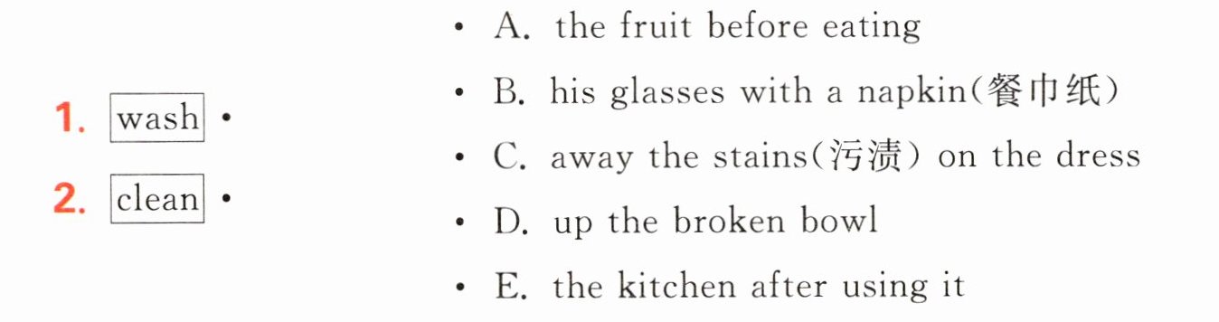 [反馈练习] 将wash和clean与对应的内容连线搭配。