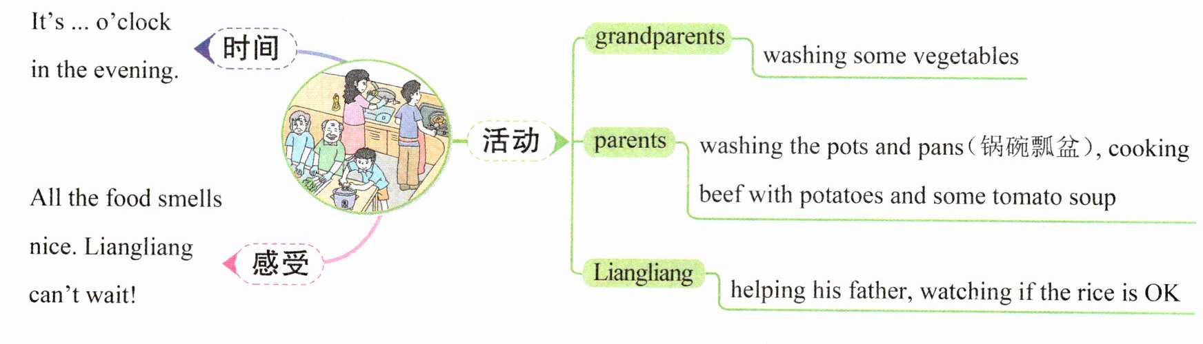 It's seven o'clock in the evening. Liangliang finishes his work. His family are busy in the kitchen.