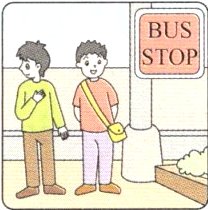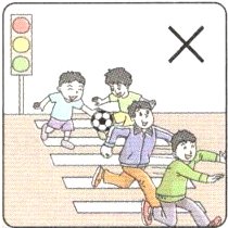 1. play football on, road, safe 2. cross, with other people 3. waiting at, waiting for 4. red man, must, green man