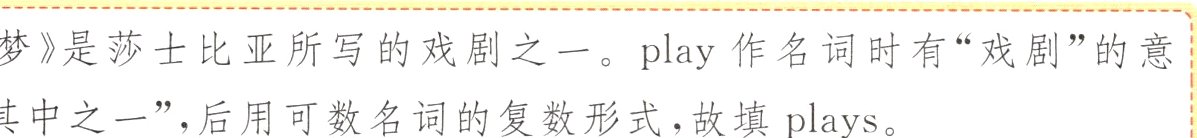 点拨 句意:《仲夏夜之梦》是莎士比亚所写的戏剧之一。play作名词时有“戏剧”的意思,one of ...表示“……其中之一”,后用可数名词的复数形式。