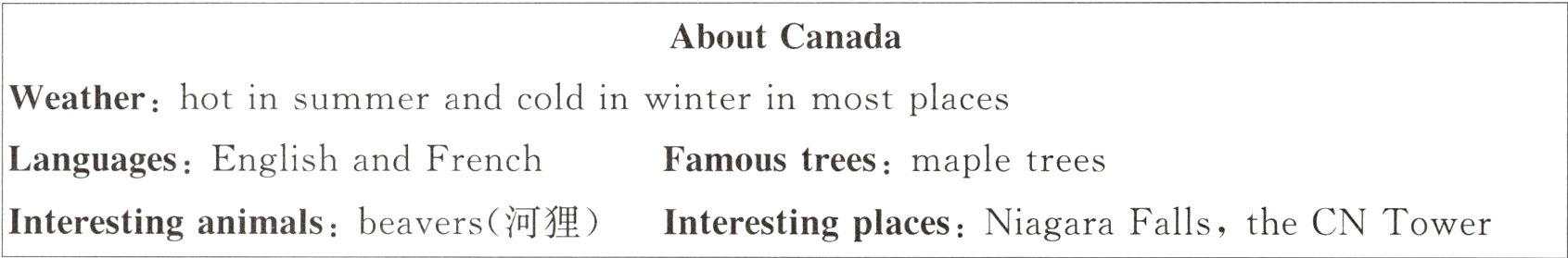 四、亮点原创 来自加拿大的交换生 Mark 想在展板中介绍自己的国家,请根据他准备的信息卡,帮助他写一篇短文吧!