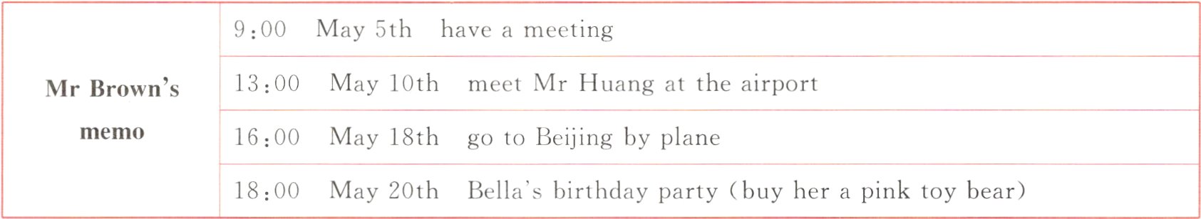 四、新情境 真实情境 Mr Brown在五月将会很忙碌。阅读他的备忘录,完成他的行程安排。