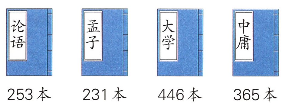 (1)《论语》和《大学》共多少本? (2)《中庸》比《孟子》多多少本?