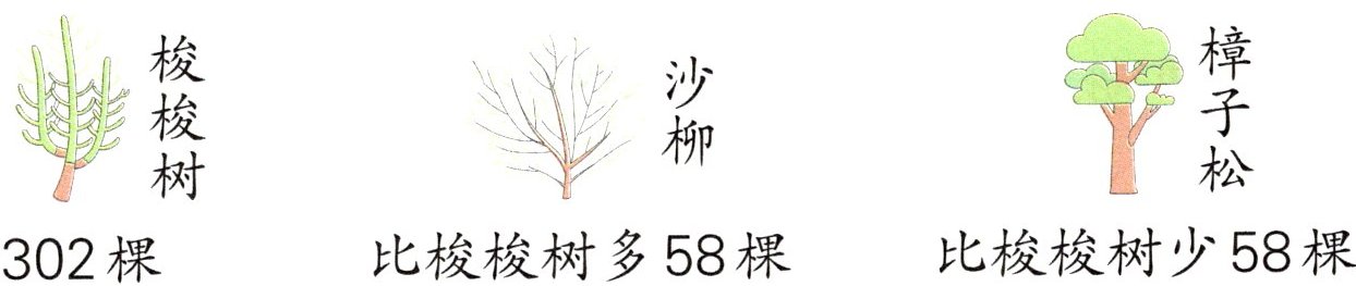 (2) 所提问题不唯一,如樟子松种植了多少棵? 302 - 58 = 244(棵) 答:樟子松种植了244棵。