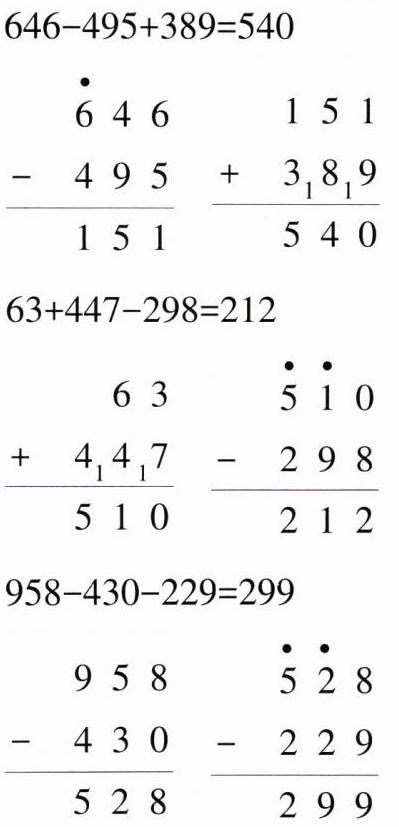 646 - 495 + 389= 63 + 447 - 298= 958 - 430 - 229=