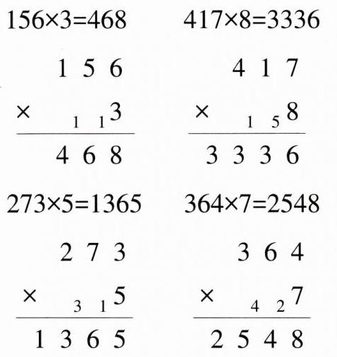 $156×3=$ $417×8=$ $273×5=$ $364×7=$