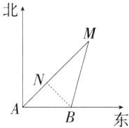 D 如图,过点B作BN⊥AM于点N,由题意得AB = 40×1 = 40海里,∠ABM = 105°,在Rt△ABN中,BN = AB·sin 45° = $20\sqrt{2}$海里,在Rt△BNM中,∠MBN = 105° - 45° = 60°,