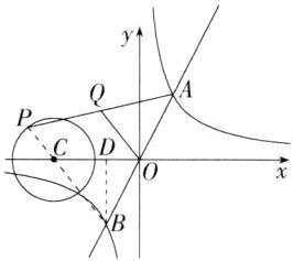 16.推理能力(2023山东泰安泰山二模)如图,一次函数y = 2x与反比例函数y = $\frac{k}{x}$(k>0)的图象交于A,B两点,点P在以C(-2,0)为圆心,1为半径的☉C上,Q是AP的中点,已知OQ长的最大值为$\frac{3}{2}$,则k的值为 ________.