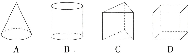 A选项A,圆锥的主视图是三角形;选项B,圆柱的主视图是矩形;选项C,三棱柱的主视图是矩形,中间还有一条虚线;选项D,正方体的主视图为正方形.故选A.