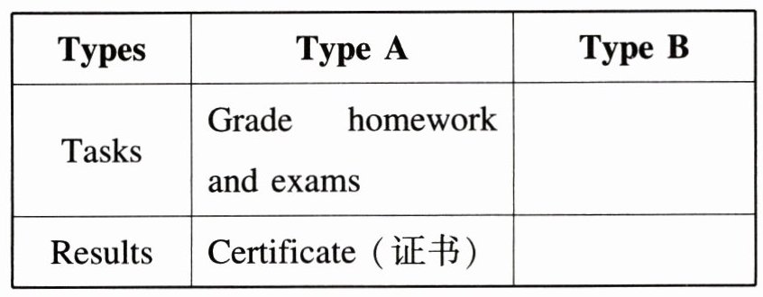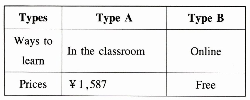 23. B 细节理解题。从Types of the course部分的表格可知,如果你选择课程B,你可以在线上课。在线上课意味着你可以在任何地方包括在家里学习。故选B。