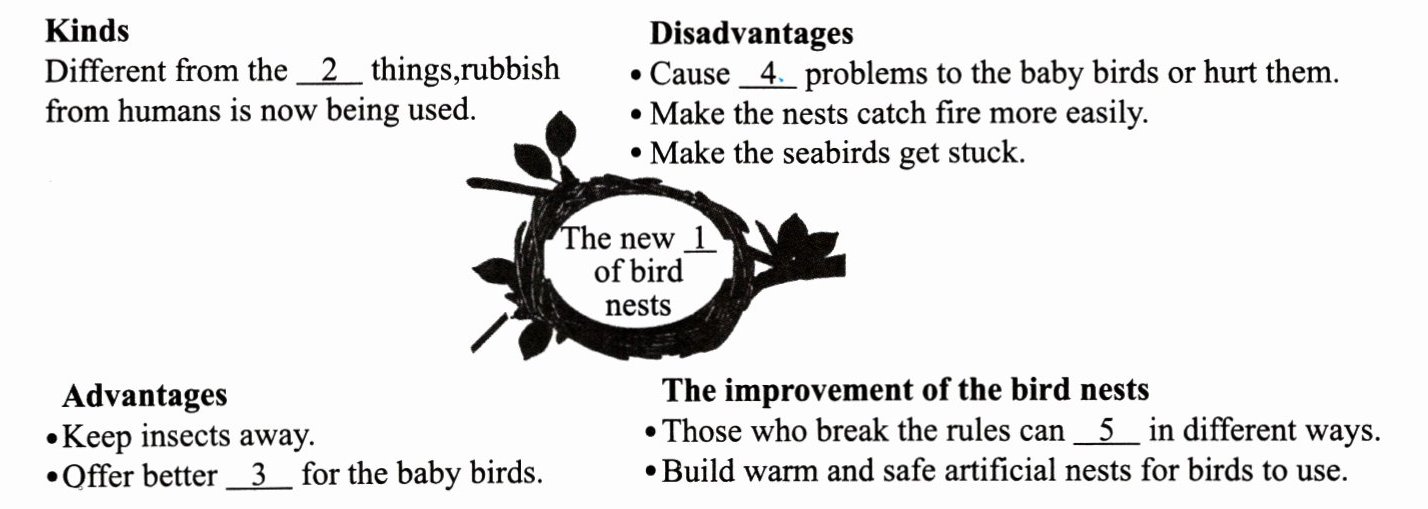 To improve the situation, people shouldn’t be allowed to smoke or leave rubbish behind when there are many trees around. And to make the idea work, people will have to pay certain money or help clean the area for some time if they don’t follow the rule. This protects the environment as well as the birds living nearby. We can also play our part by building artificial (人工的) nests that are warm and safe for birds to use instead of forcing them to build their own.