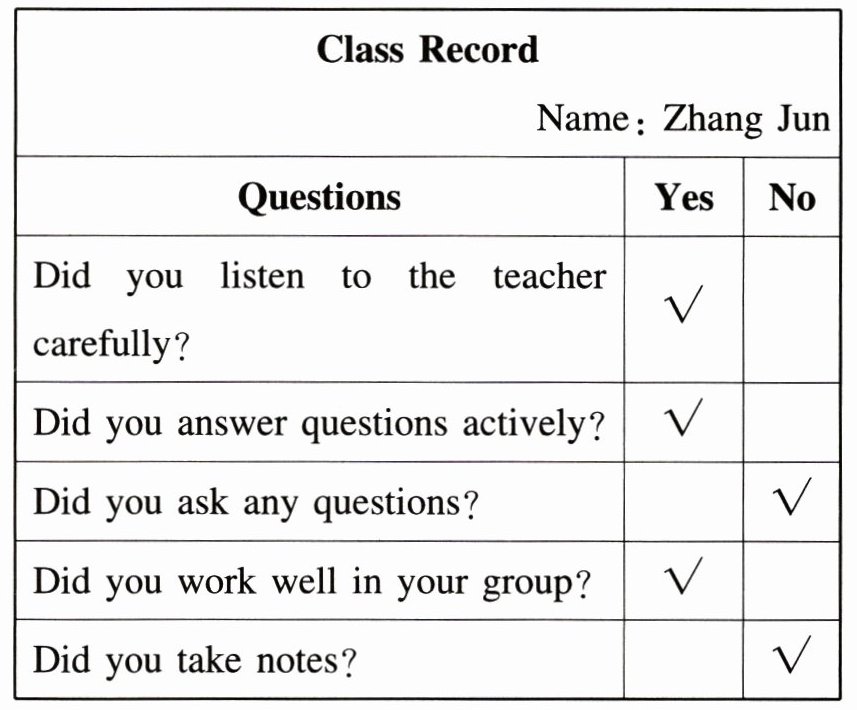 Well done, Zhang Jun! You listened to the teacher carefully in class and answered questions actively. Besides, you worked well in your group and always got good grades in group activities.