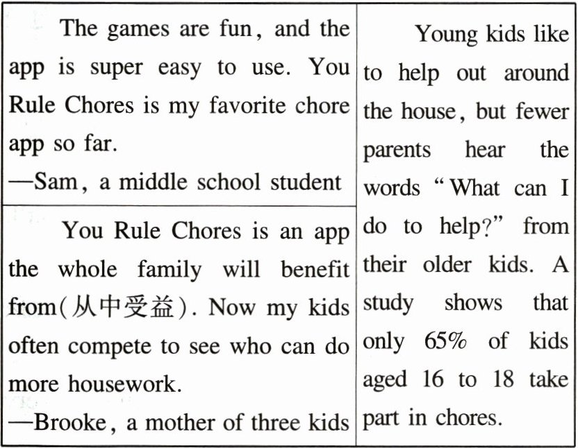 “It” refers to “asking children to help with chores”.@@The app turns children into housework helpers through smartphone games.@@He thinks the app is super easy to use.@@Choose a character.@@Yes, I do. Because my parents work very hard, and I want to help them.
