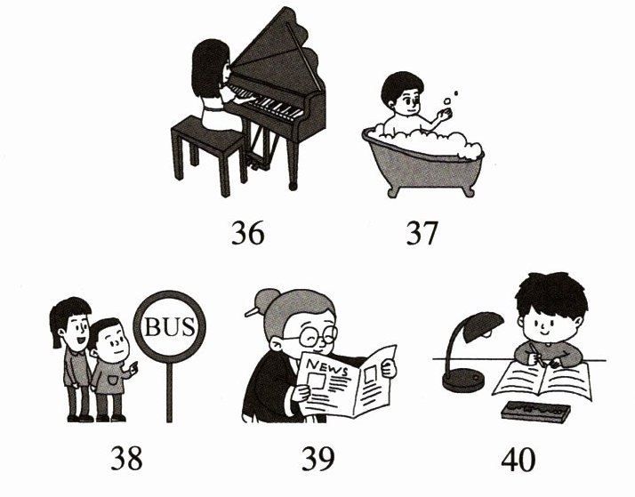 She was playing the piano@@I was taking a bath@@They were waiting for the bus@@She was reading a newspaper@@I was doing my homework