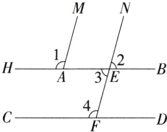 如图,直线NF与直线HB,CD分别交于点E,F,直线AM与直线HB交于点A,且∠1 = ∠4 = 105°,∠2 = 75°.试说明AM//NF,AB//CD.
