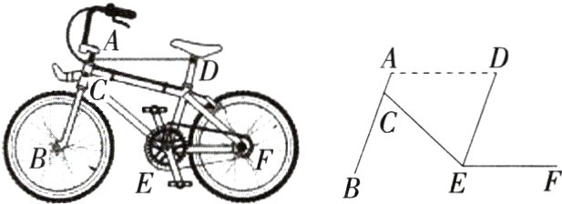 11.情境题·共享单车(2024浙江舟山定海三模改编,4,)骑共享单车这种“低碳”出行方式已融入我们的日常生活.如图所示的是共享单车车架的示意图.已知AB//DE,∠BCE = 67°,∠CEF = 137°,若AD//EF,则∠ADE的度数为(M7207006) ( )