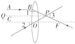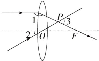 3. (光的折射 铅笔模型)(2023山西中考)如图,一束平行于主光轴(直线OF)的光线经凸透镜折射后,其折射光线与一束经过光心O的光线相交于点P,点F为焦点。若∠1 = 155°,∠2 = 30°,则∠3的度数为 ( )