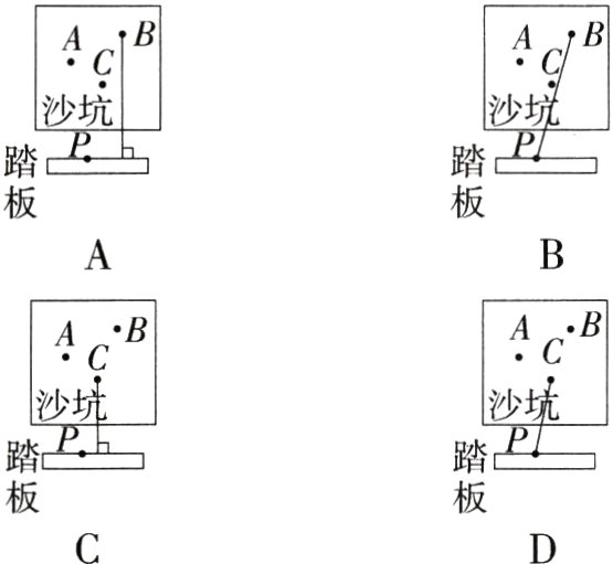 5.[跨体育与健康·跳远]小明参加跳远比赛,他从地面上踏板的点$P$处起跳落到沙坑中,两脚后跟与沙坑的接触点分别为$A,B$,小明未站稳,一只手撑在沙坑$C$点,则选项中跳远成绩测量正确的是 ( )